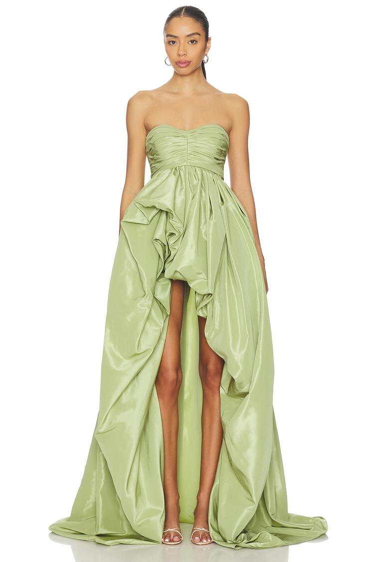 A matte light green taffeta gown with a figure-flattering sweetheart neckline and ruched bodice offers an elegant silhouette. The strapless, fitted design flows into a dramatic high-low hemline featuring ruffled draping for added movement and sophistication. Crafted from smooth polyester fabric, this gown is perfect for formal events, cocktail parties, galas, and wedding guest occasions. The back zipper closure ensures a sleek fit while the fully lined construction adds comfort and polish to this standout dress.