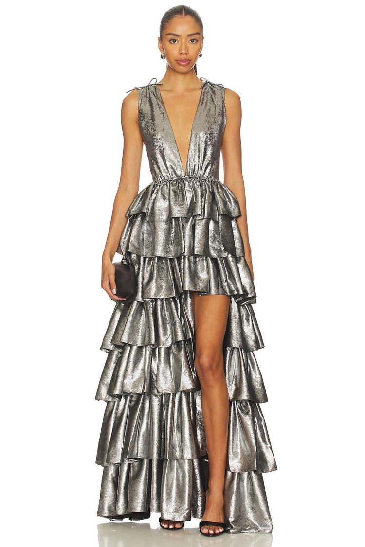 Metallic silver polyester fabric shimmers with every step in this elegant A-Line gown featuring a dramatic high-low hem and tiered ruffle layers that add voluminous texture. The deep plunge neckline and open back with tank shoulders create a sophisticated silhouette that flatters the figure with a fitted waist. Perfectly suited for cocktail parties, formal events, and gala evenings, this gown combines striking design details with all-weather versatility, ensuring you stand out with refined glamour and timeless style.