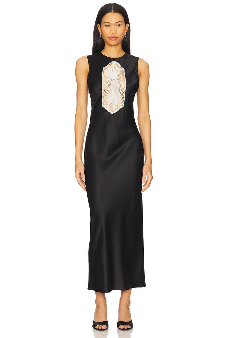 A sleek black silk column dress features a refined crew neckline and sleeveless silhouette, highlighted by an elegant cream lace panel on the front. The slim fit skims the body effortlessly, while the clean maxi hemline adds timeless sophistication. Crafted from midweight silk, this dress exudes luxury and comfort, secured by a delicate back button loop closure. Ideal for cocktail events, formal occasions, or a stylish date night, it blends classic elegance with modern simplicity for versatile, confident dressing.