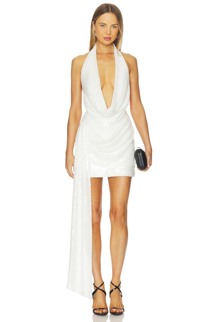A shimmering sequin-embellished mini dress with a plunging cowl neckline and halterneck styling offers a sleek, fitted silhouette. Featuring a draped fabric overlay and a tie-back detail, this modern white wrap dress exudes sophistication and sexiness. The clean hemline and sleeveless design make it ideal for cocktail parties, night outs, or date nights. Crafted from polyester and acetate with a hint of elastane, it ensures comfort and a flattering fit in all seasons.