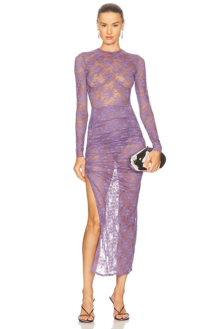 Intricately crafted from sheer lace nylon, this long-sleeve sheath midi dress features a bodycon fit that elegantly hugs the silhouette. The high crew neckline and covered back provide balance to its seductive side slit, creating a modern, sexy allure. Perfect for spring to autumn nights, this dress shines at cocktail events, date nights, or upscale evening outings. The hidden back zipper closure ensures a sleek finish, while the partially lined design and sheer panels add a daring, fashionable edge to your wardrobe.