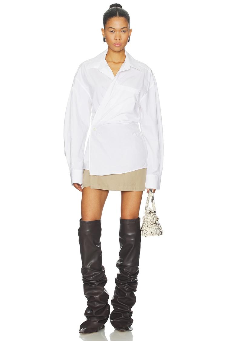 Clean lines and a crisp white cotton poplin fabric define this mini wrap dress, featuring a classic collar and long sleeves with a front button closure. The regular fit and mini length create a versatile silhouette perfect for casual brunches, relaxed date nights, or stylish everyday wear. Its minimalist modern style and midweight fabric make it an ideal transitional piece for spring through autumn. The simple, structured design offers effortless sophistication suitable for multiple occasions, combining comfort with contemporary appeal.