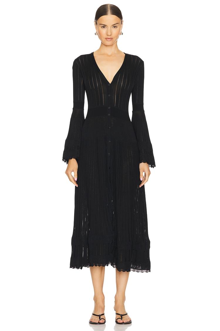 Subtle pinstripes and a stretch knit fabric define this elegant black midi dress, featuring a flattering fitted bodice and a flowing fit and flare silhouette. The deep V-neckline and long bell sleeves add a sophisticated touch, while the front button closure enhances its modern appeal. Perfect for autumn and winter evenings, this dress suits cocktail parties, date nights, and nights out with friends. Its clean hemline and unlined construction make it a comfortable yet chic choice for a variety of occasions.