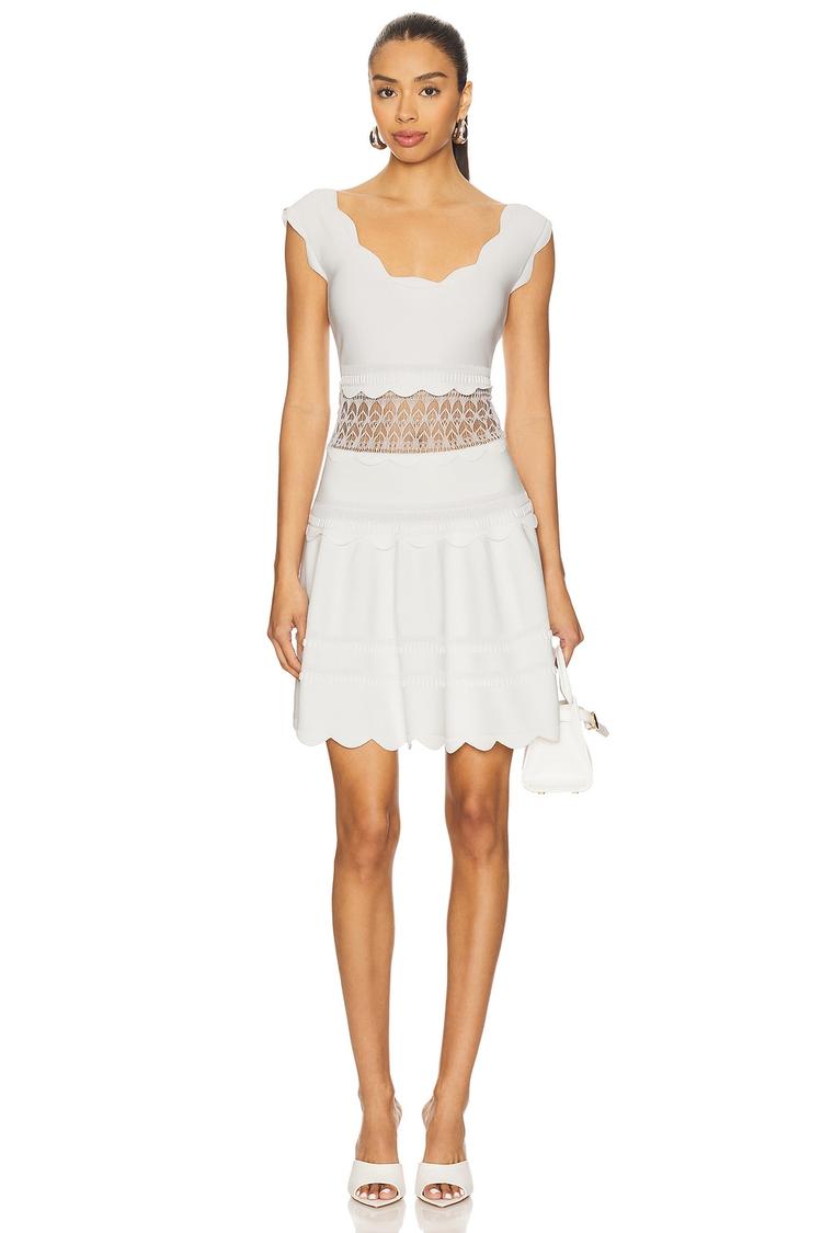 Soft white viscose and nylon knit fabric forms a fitted fit and flare silhouette with a mini length perfect for warmer seasons. A scalloped square neckline and cap sleeves frame the upper body, while a sheer lace trim panel accents the waist, adding romantic texture. The skirt flows with ruffled and scalloped hem detailing, creating delicate movement. This elegant and classic dress transitions effortlessly from brunch to date night or cocktail events, combining sophisticated design with comfortable midweight knit fabric.