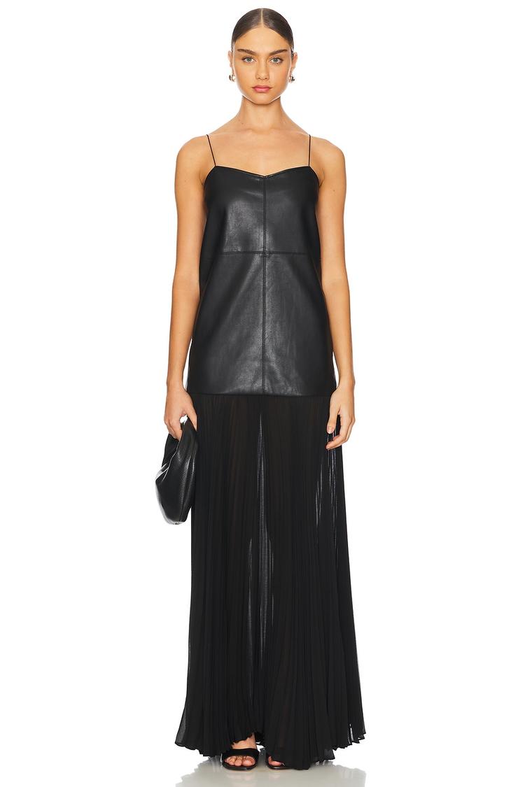A sleek black slip dress features a structured faux leather bodice paired with a flowing pleated skirt, creating a stunning maxi silhouette. The slim fit and sweetheart neckline with delicate spaghetti straps offer an elegant and minimalist style perfect for cocktail evenings, date nights, or sophisticated night outs. Finished with a hidden back zipper and partially lined for comfort, this dress blends modern chic with timeless design, making it a versatile choice for all weather occasions.