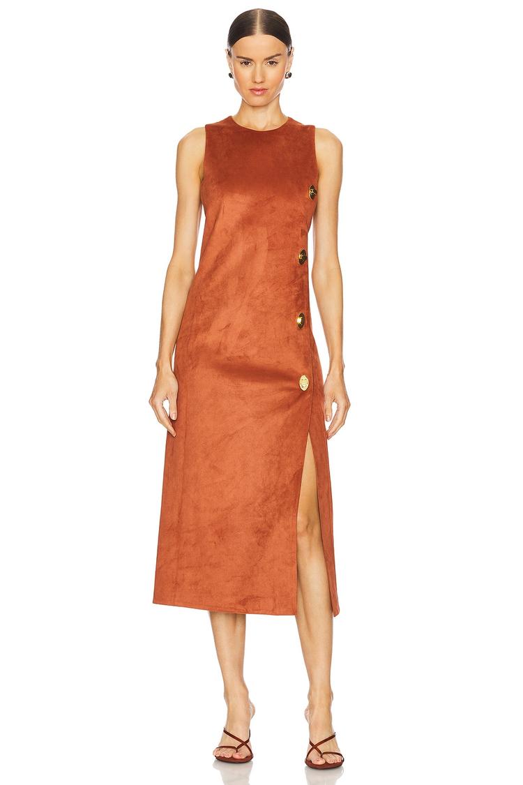 Midweight rust suede and a sleek sheath silhouette shape this elegant midi dress featuring a round neckline and sleeveless cut. The fitted design with a side slit and faux gold button accents along the front skirt adds a sophisticated touch, ideal for autumn and winter evenings. The concealed back zipper ensures a smooth finish, while the fully lined fabric provides comfort. Perfect for cocktail parties, date nights, or stylish nights out, this Alexis Kalita Dress combines modern style with refined details for a polished look.