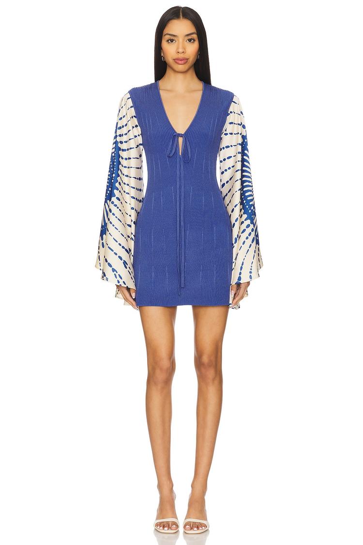 Heavyweight ribbed knit fabric shapes a fitted mini shift dress with a flattering V-neckline and flared satin sleeves in contrasting abstract patterns. The keyhole back with front tie closure adds a delicate detail to this modern, chic dress. Its lightweight yet structured blend of rayon, nylon, elastane, and polyester makes it perfect for spring through autumn wear. Ideal for brunches, date nights, or evening outings, this elegant piece pairs sophistication with a playful edge in its striking blue and white palette.