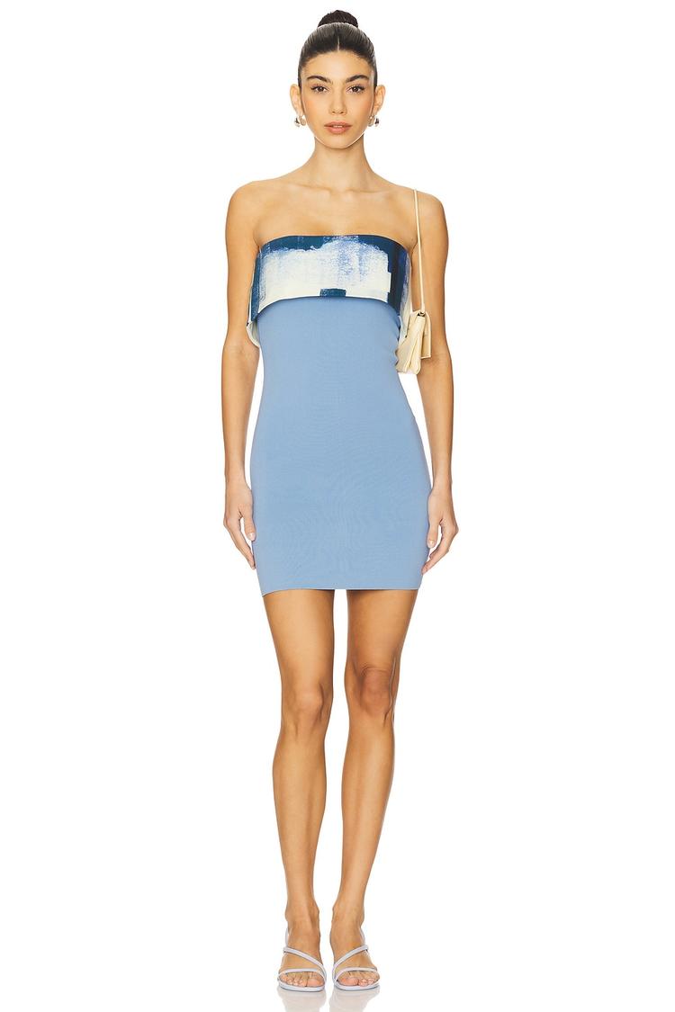 A sleek silhouette in a mini sheath shape showcases a fitted profile with a straight, strapless neckline, perfect for evening occasions. The lightweight ribbed knit fabric in soft matte light blue complements the contrasting printed applique overlay at the bodice, adding a modern graphic touch. Concealed back zipper ensures a smooth finish and easy wear. This chic piece is versatile for cocktail parties, date nights, or stylish night outs, combining comfort and contemporary elegance in one refined look.