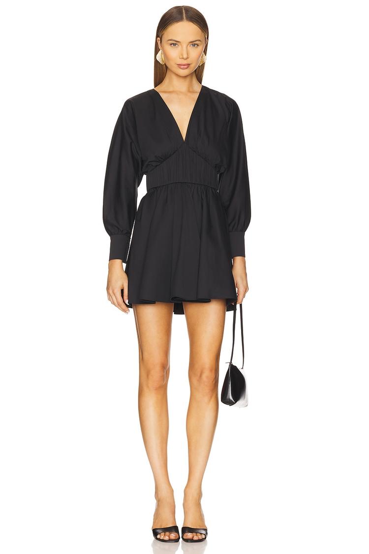 Soft matte black poplin shapes a mini shift dress with a relaxed fit and a flattering elastic waistband. The deep V-neckline and long regular sleeves add classic appeal, while ruffled hem details bring a subtle feminine touch. Concealed back zipper with snap closure ensures a sleek silhouette, and side seam pockets add practicality. Crafted from a cotton-viscose blend with elastane for gentle stretch, this versatile piece suits brunch, date nights, and cocktail events with elegant ease.
