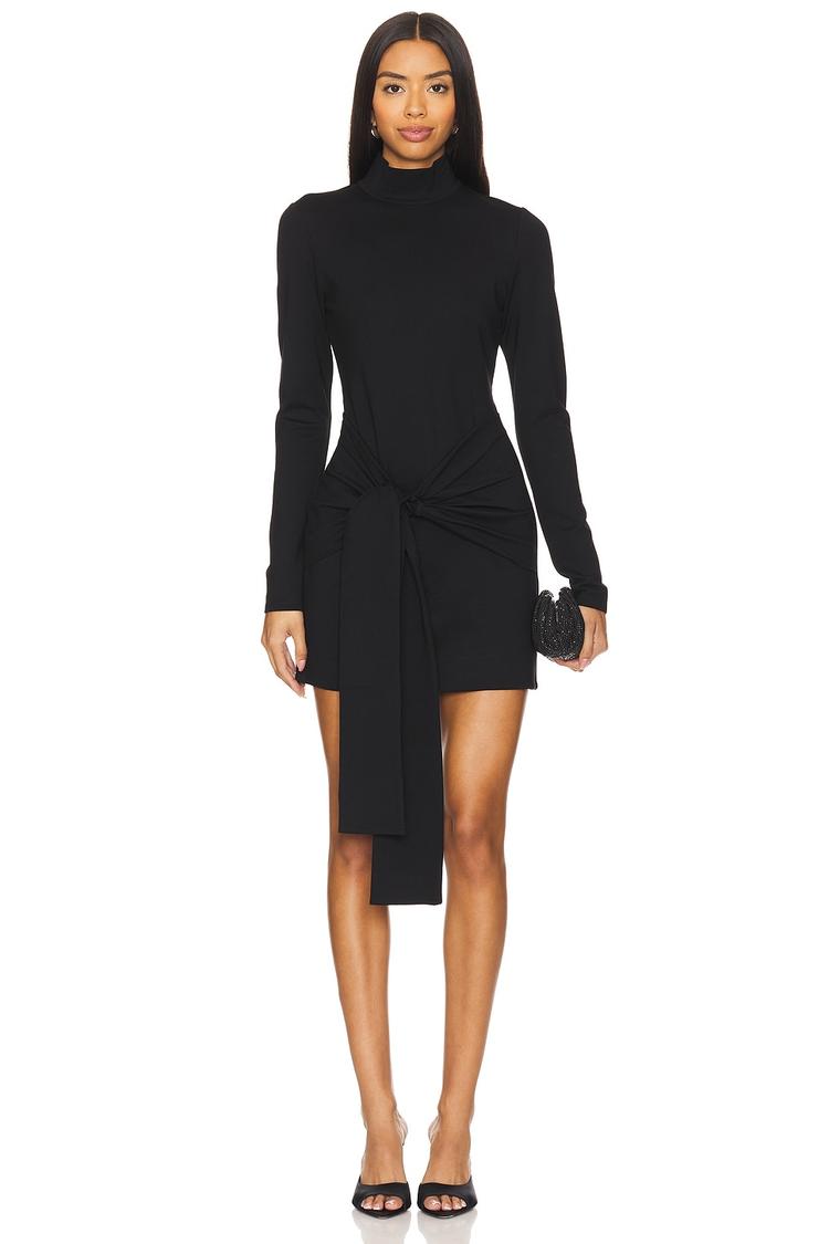 A sleek matte black sheath dress crafted from a midweight jersey blend of rayon, nylon, and elastane offers a fitted silhouette that flatters with a chic turtle neck and long sleeves. Its mini length and asymmetric draping at the front add modern elegance, making it an excellent choice for sophisticated night outs, cocktail parties, or date nights during cooler autumn and winter evenings.