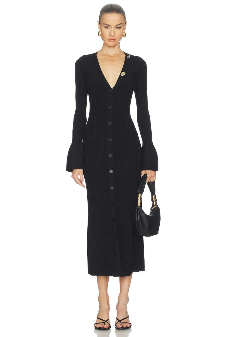 A streamlined black sheath silhouette with a flattering deep V-neck and button-down front creates timeless elegance. The fitted midi length contours the body smoothly, while the long sleeves end in subtle ruffled cuffs for a refined touch. Crafted from a soft knit blend of viscose and nylon, this dress offers comfortable stretch and warmth, ideal for autumn and winter evenings. Versatile enough for cocktail parties, date nights, or night outs, it balances minimalist sophistication with graceful detailing.