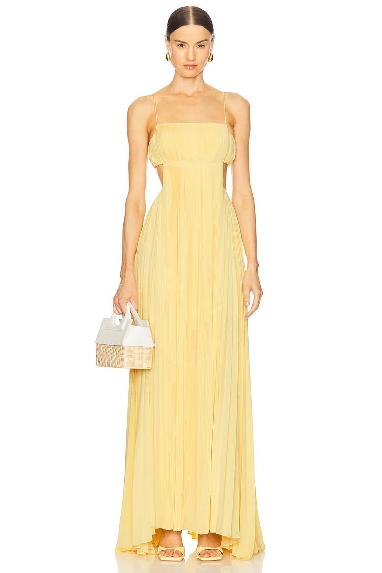 Sunlit occasions call for this elegant column maxi dress in a soft matte yellow polyester plissé fabric. The fitted silhouette features a strapless straight neckline and an open back with concealed zipper closure, enhanced by boning in the bodice and tasteful cut-out sides. Its clean hemline and midweight fabric provide graceful movement and sophistication, making it ideal for cocktail parties, date nights, or wedding guest attire during spring and summer events.