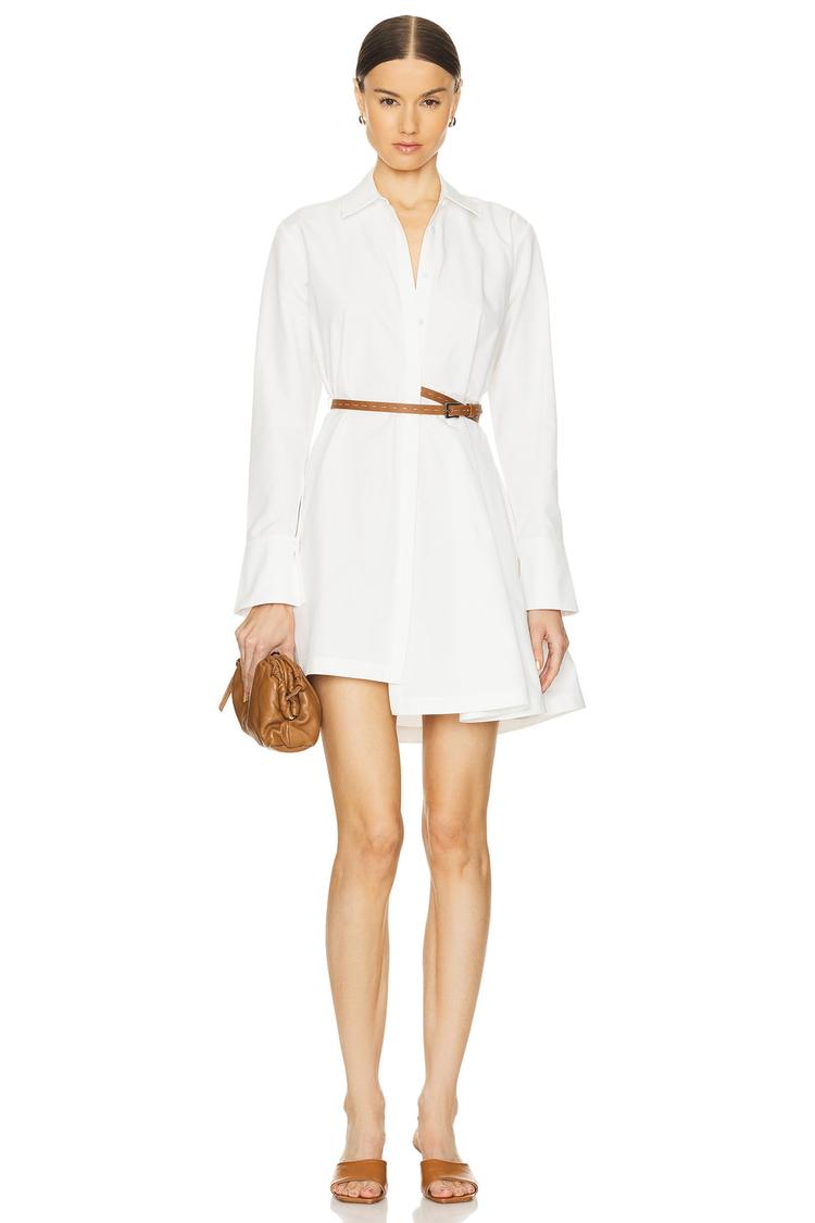 Clean lines and a crisp white poplin fabric define this classic shirt dress, elevated by brown leather shoulder straps and a side belt that cinches the waist for a flattering silhouette. The mini length and long sleeves make it an ideal choice for spring through autumn, balancing polished style with casual ease. Its invisible back zipper closure enhances the streamlined look, perfect for brunch, casual workdays, or daytime events where understated sophistication is key.