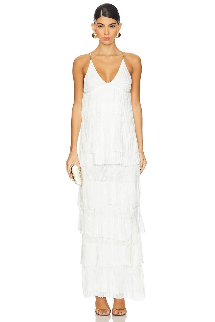 Soft white viscose layers in heavyweight tiered plissé fabric sculpt a flowing column silhouette that radiates modern elegance. The deep V-neckline and strappy back with gold-tone shoulder straps add sophisticated allure, perfect for warm spring and summer occasions. Fully lined for comfort, this maxi-length dress moves gracefully with every step, making it an ideal choice for brunches, date nights, and cocktail events. Pull-on styling ensures effortless wear, while the layered hemline adds subtle movement and texture to the look.