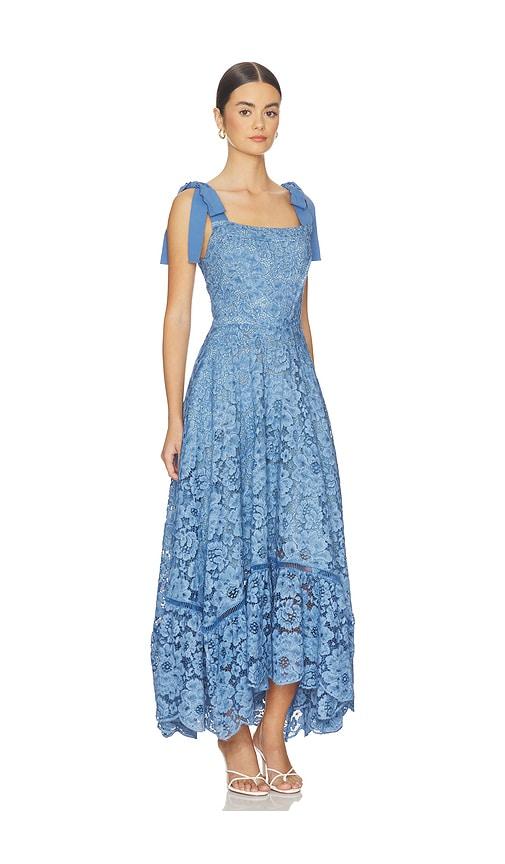 ALICE + OLIVIA ROSALEE LACE BUSTIER MAXI DRESS IN BLUE.