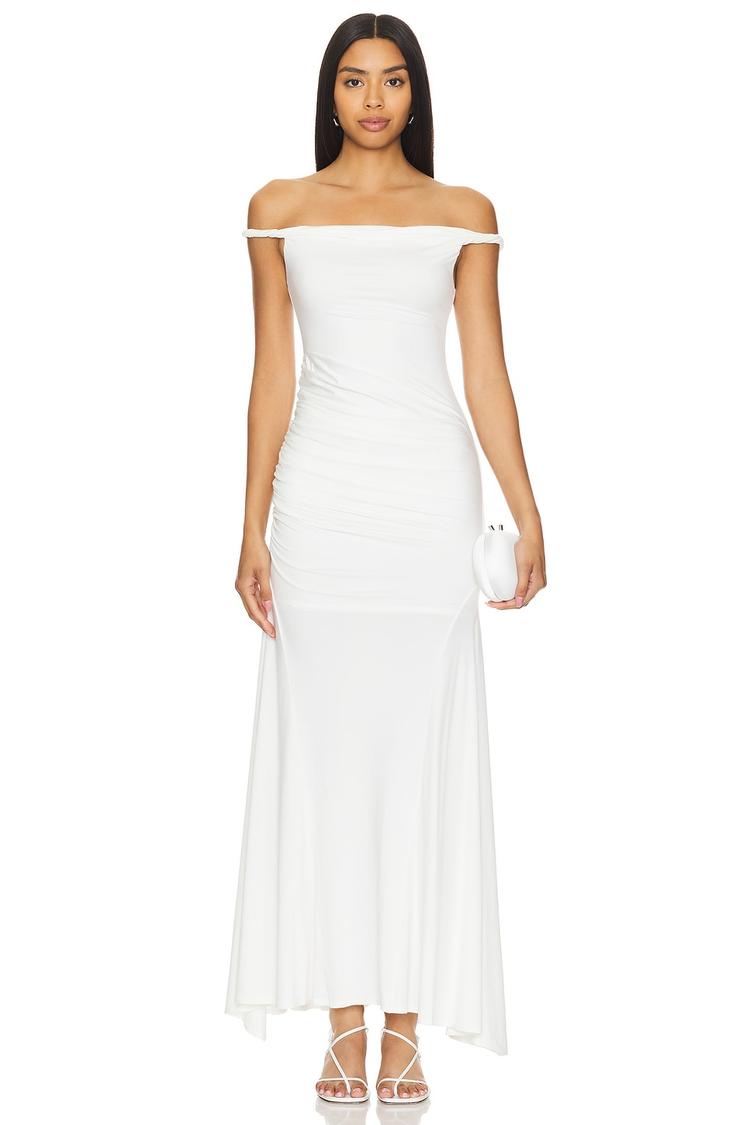Soft white jersey knit fabric with delicate ruching along the sides sculpts a fitted sheath silhouette that flows into a clean midi hem. This strapless dress features a straight neckline and an exposed zipper at the open back, combining modern elegance with sophisticated detailing. Fully lined with a blend of modal, nylon, and elastane, it offers a comfortable stretch fit ideal for cocktail parties, date nights, or evening outings. The minimalistic design and sleek cut make it a versatile addition to any refined wardrobe.