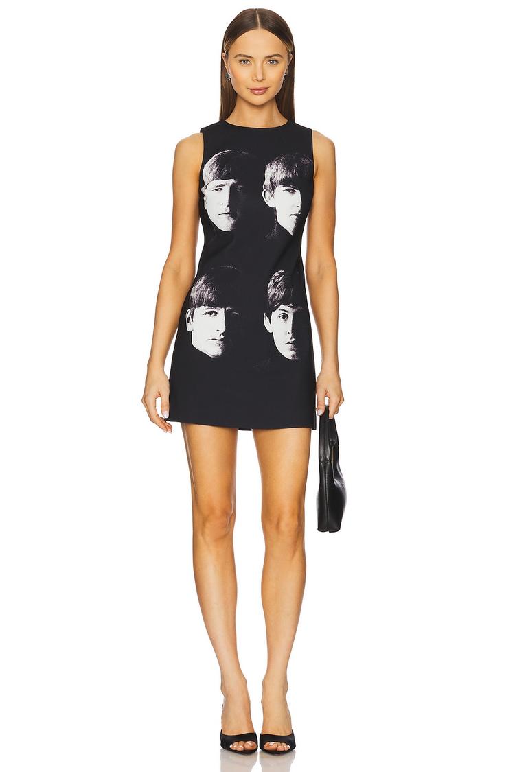 Graphic faces in white contrast sharply against a matte black crepe base, forming a fitted shift silhouette with a mini length that highlights the legs. The sleeveless design and round neckline add to its modern, chic appeal. An exposed back zipper enhances the streamlined look while the fully lined fabric ensures comfort. Ideal for casual outings, date nights, or a stylish evening event, this versatile piece blends contemporary art-inspired graphics with timeless elegance.