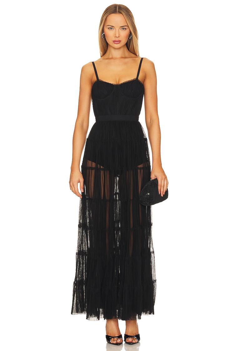 Layered pleated tulle and a fitted silhouette define this matte black maxi slip dress with a flattering sweetheart neckline and delicate spaghetti straps. The semi-sheer tiered skirt offers subtle movement and elegance, perfect for cocktail parties, formal events, or a chic night out. An exposed back zipper and unpadded underwire cups with boned bodice provide structure and sophistication. Crafted from nylon and polyester, this dress blends delicate texture with a sleek finish for all-weather versatility.
