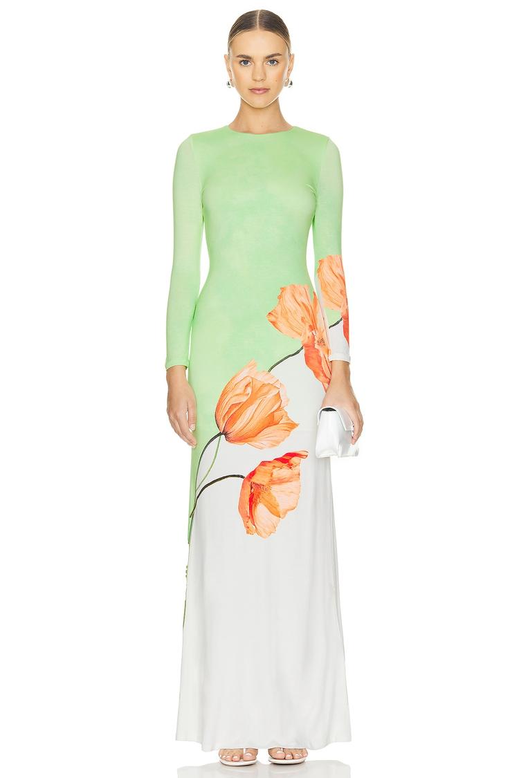 A slender column silhouette meets a maxi length in this elegant dress, featuring a soft matte light green jersey fabric that blends viscose, elastane, and nylon for a comfortable fitted wear. Long sleeves and a classic round neckline enhance its sophisticated appeal, while vibrant matte orange floral prints adorn the front, sleeves, and skirt over a matte white base. The covered back with a discreet zipper closure ensures a smooth fit. Ideal for spring and summer occasions such as cocktail parties, formal events, or date nights, this dress combines timeless style with modern comfort.