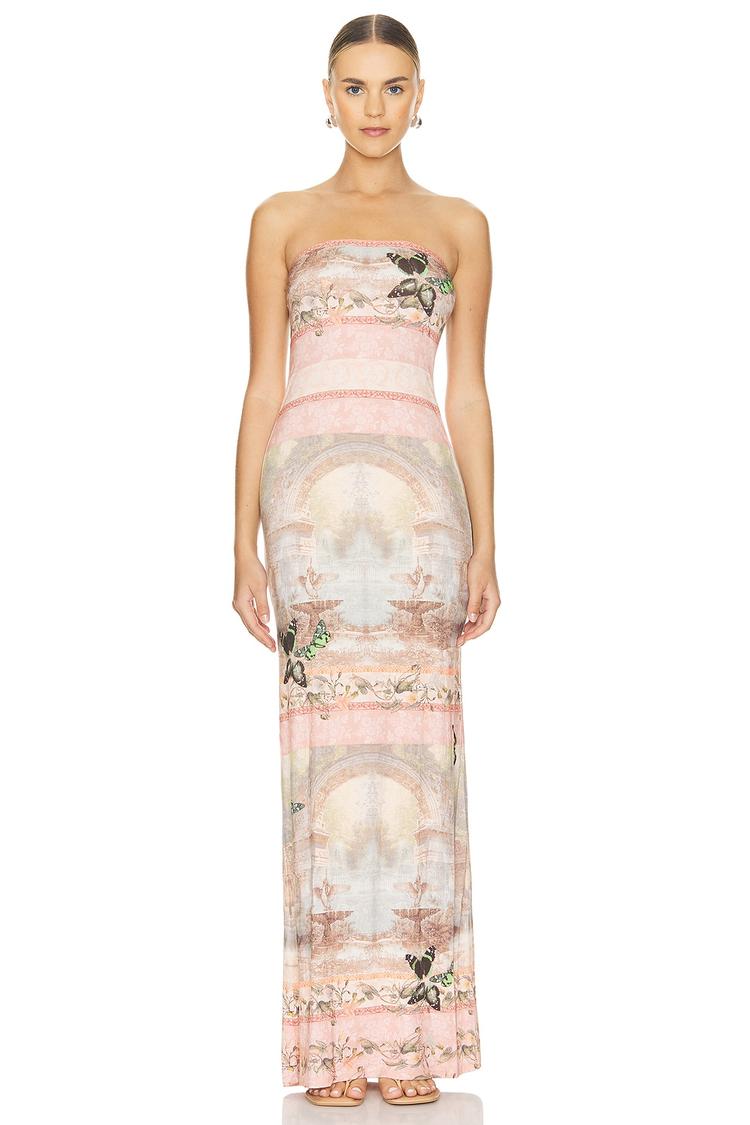 Soft jersey fabric and a figure-hugging column silhouette create a stunning strapless maxi dress ideal for spring and summer occasions. The matte pink base is adorned with delicate abstract and floral patterns in beige, green, and brown hues, offering a fresh and elegant vibe. Featuring a covered back with a discreet zipper closure, this fitted dress flatters the silhouette while providing comfort with elastane stretch. Its clean hemline and modern style make it a versatile choice for brunches, cocktail parties, and date nights, combining effortless sophistication with wearable luxury.