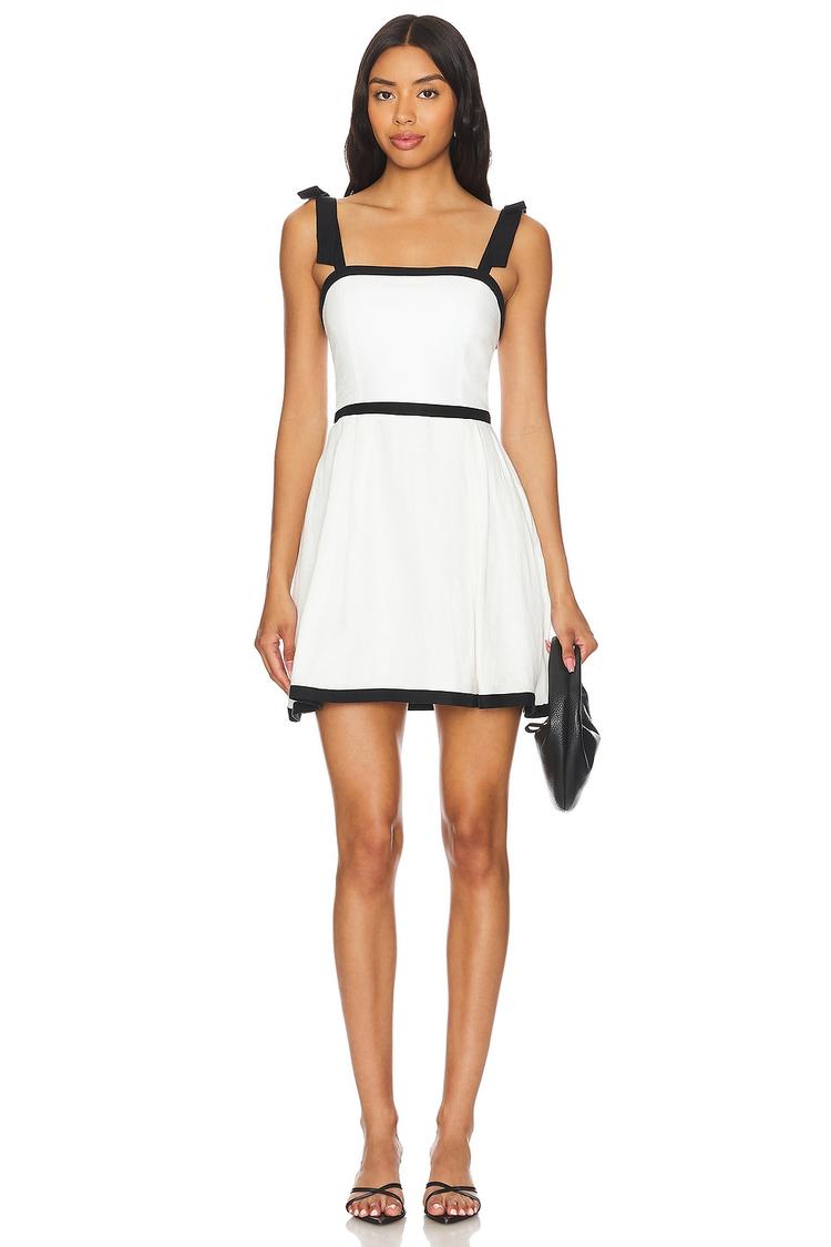 Crisp white linen and cupro blend crepe fabric shape this elegant mini dress featuring a flattering A-line silhouette and a classic square neckline. Wide black straps with delicate tie bows add charm, while the smocked back ensures a comfortable, regular fit. Perfectly finished with a clean hemline and back zipper closure, this dress shines in spring and summer settings. Ideal for brunches, date nights, or cocktail events, its timeless black and white contrast offers versatile sophistication for your wardrobe.