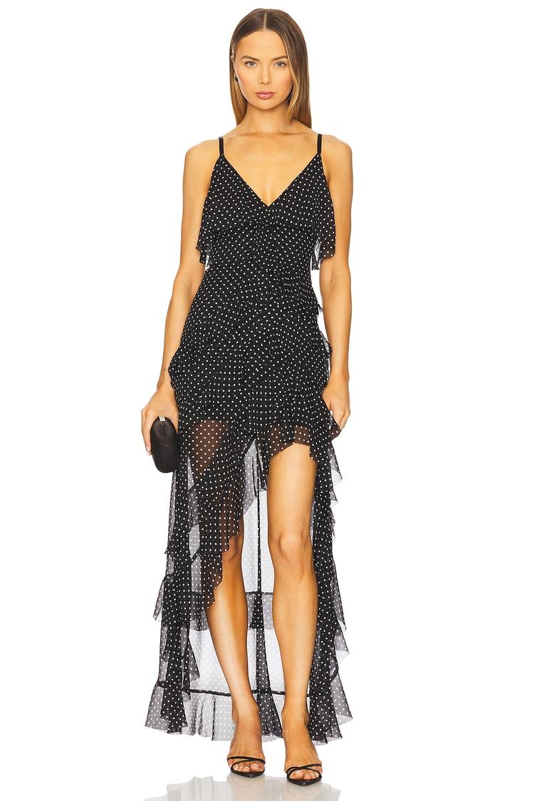 Delicate ruffles cascade down an asymmetrical hemline on this elegant slip dress, crafted from midweight chiffon and silk blend fabrics. The slim fit silhouette complements a plunging V-neckline and adjustable spaghetti straps, while the lace-up tie-back adds a chic and modern detail. Adorned with classic white polka dots on a matte black base, this dress is perfect for cocktail parties, date nights, or stylish brunches. Sheer panels and a layered ruffled hem enhance the flowy, feminine allure, making it a standout piece for spring, summer, and autumn occasions.