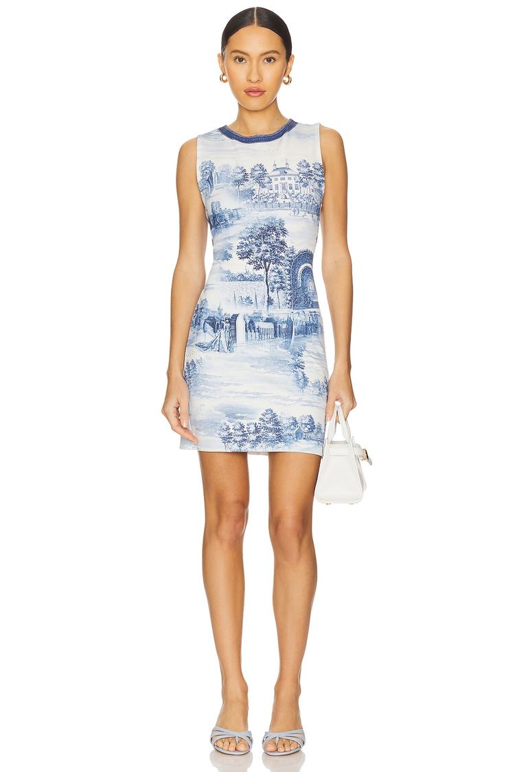 A sleek mini shift dress crafted from a midweight slinky jersey fabric combines modern style with a comfortable slim fit. Featuring a striking blue and white graphic print all over, this sleeveless dress showcases a classic round neckline and a clean hemline, complemented by a discreet back zip closure. Ideal for spring and summer evenings, it effortlessly suits cocktail parties, date nights, and night outs, offering a trendy yet timeless silhouette in breathable nylon and elastane jersey.