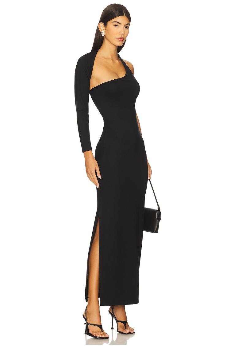 A sleek black jersey column dress with a striking asymmetric neckline and sleeveless design creates a modern, minimalist silhouette. The maxi length features a high slit on the right leg, adding a subtle edge to the elegant slim fit. Perfect for cocktail parties, date nights, or a chic night out, this pull-on dress offers effortless style and comfort with its soft, stretchy fabric. Its clean lines and sophisticated design make it a versatile wardrobe staple suitable for all seasons.