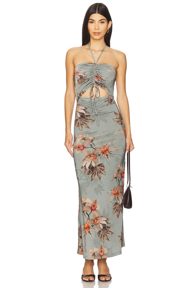 Softly embracing a slinky jersey fabric, this halterneck maxi slip dress features an all-over floral print in muted rust and brown tones against a light gray base. The slim fit and front ruched detailing with tie closures create a flattering silhouette, complemented by a playful cut-out and a tie-back closure at the neck. Perfect for spring and summer, it transitions seamlessly from casual brunches to date nights and vacation evenings, offering both comfort and seductive style.