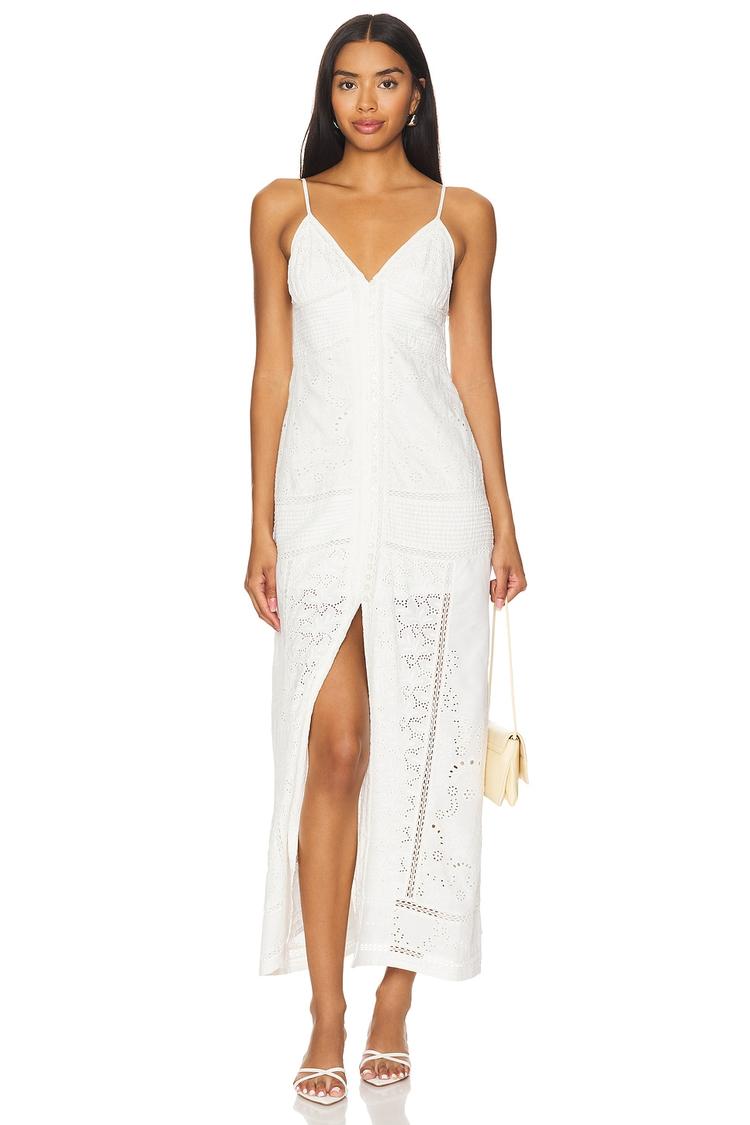 Delicate eyelet embroidery adorns this white slip dress, crafted from a lightweight blend of organic cotton and modal for breathable comfort. The slim fit contours the bust and flows into a midi-length silhouette with a subtle front slit, creating an effortlessly chic look. Adjustable spaghetti straps and a concealed side zipper provide ease and a clean finish. Ideal for warm-weather occasions like brunch, beach outings, or romantic date nights, this minimalist dress blends casual elegance with sustainable fabric choices for versatile spring and summer style.
