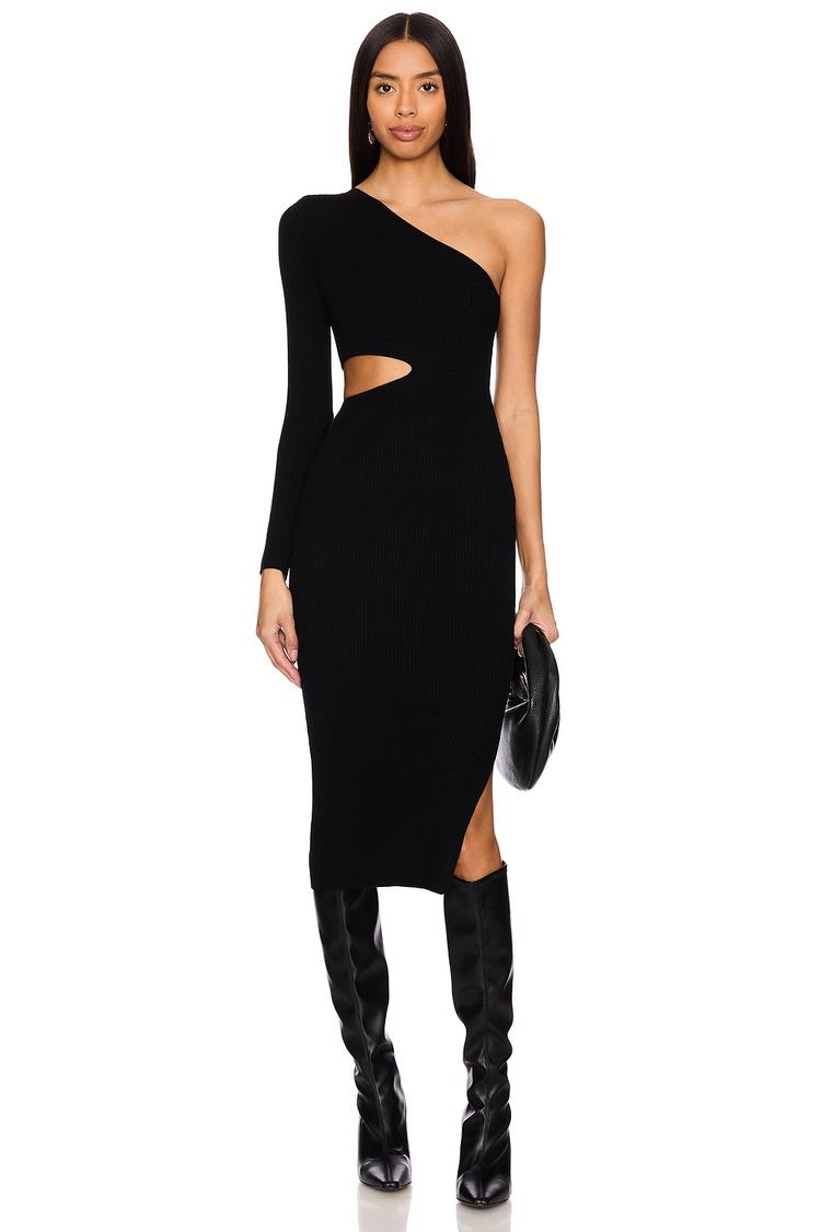 A sleek black midi sheath with an asymmetric neckline and long sleeves offers a striking silhouette. Crafted from a midweight viscose-polyester knit, it features a bold cut-out detail on the front and a slit hem for added allure. This fitted dress embodies modern chic style, perfect for autumn and winter evenings. Ideal for date nights, cocktail parties, or night outs, it combines sophistication and edge with effortless pull-on wearability.