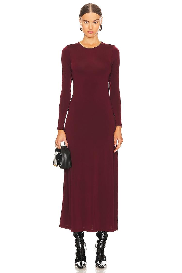 A sleek silhouette and rich burgundy hue define this maxi sheath dress crafted from a lightweight viscose-elastane jersey fabric. Its fitted cut skims the body elegantly, while long sleeves and a classic round neckline provide understated sophistication. The pull-on slip-on style ensures effortless wear, perfect for autumn and winter days. This minimalist dress transitions seamlessly from workwear to casual outings or intimate date nights, offering versatile style with clean lines and a polished finish that flatters every figure.