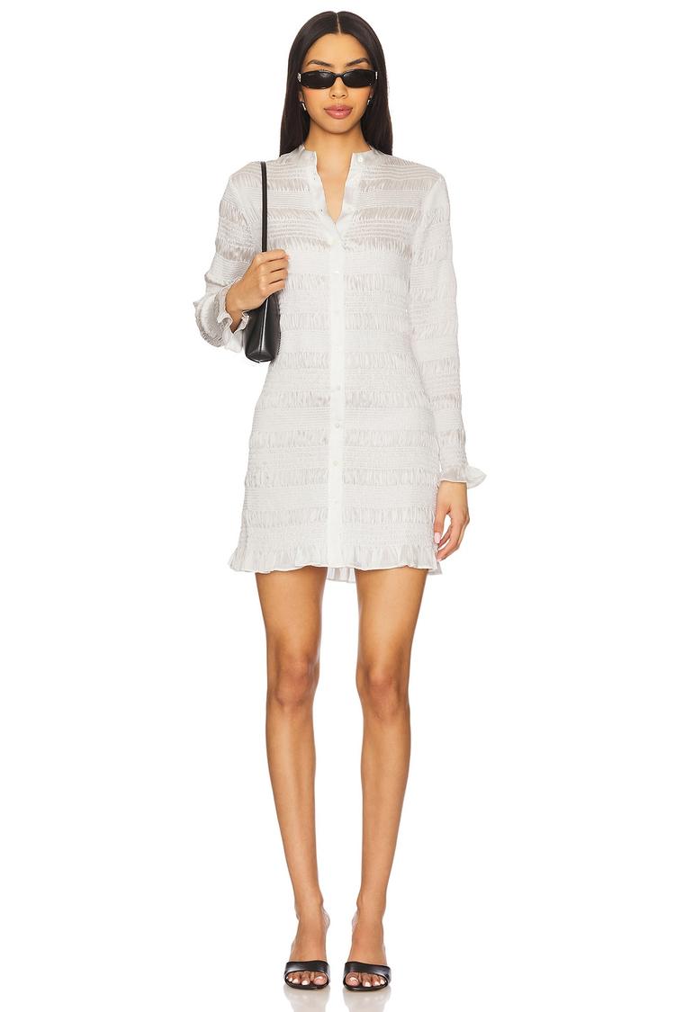 Smocked fabric detail and a classic band collar elevate this white mini shift dress crafted from smooth polyester. Featuring long sleeves with buttoned cuffs and a front button closure, the silhouette offers a regular fit that complements everyday ease with refined style. Clean hemlines and subtle texture make it perfect for casual brunches, spring outings, or relaxed date nights. The dress embodies minimalist casual chic with versatile appeal for warmer seasons.