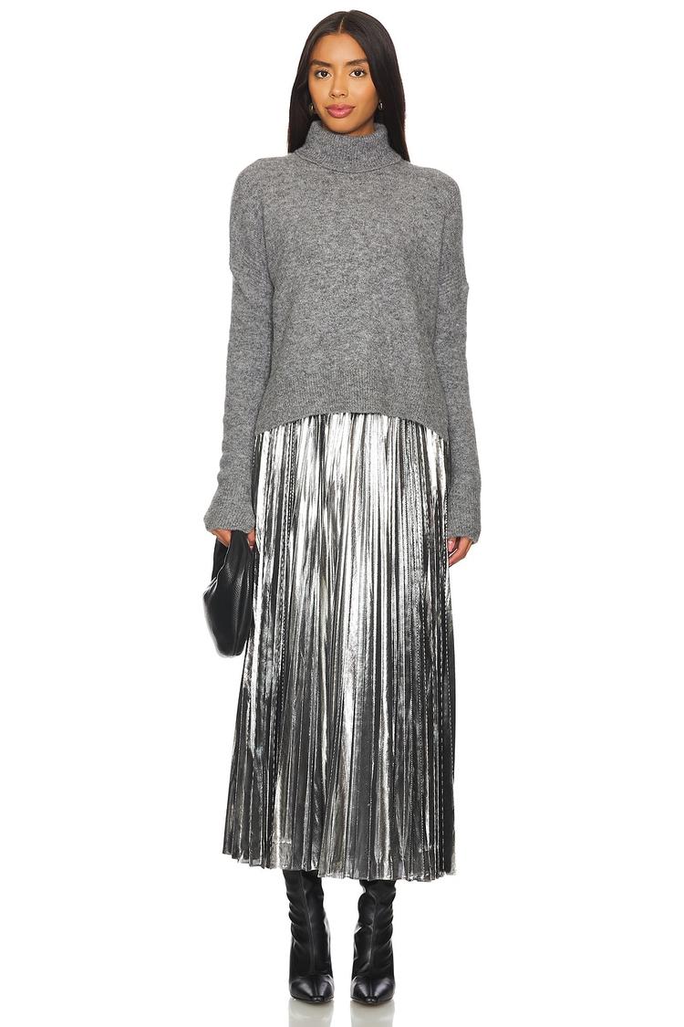 Shimmering metallic silver fabric with delicate pleats creates a sleek slip dress featuring adjustable spaghetti straps and a flattering V-neckline. The maxi length and elasticated waist offer a comfortable, adjustable fit, perfect for cocktail evenings, night outs, or date nights. Crafted from polyester with a smooth satin-like finish, this sophisticated piece blends modern elegance with versatility, making it an ideal choice for autumn and winter events when paired with layering pieces.