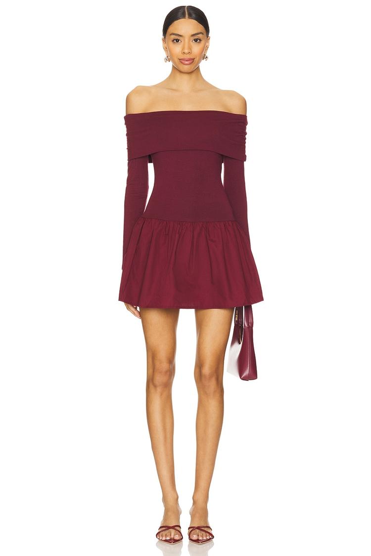 An off-shoulder neckline and long sleeves complement this fitted mini dress in a rich matte burgundy hue. Crafted with a stretchy viscose-elastane jersey bodice and a structured polyester-cotton poplin ruffled hem, it balances comfort with flirty flair. The A-line silhouette and pull-on styling make it easy to wear for brunch, date nights, or evening outings during spring, summer, and autumn. Its modern, chic vibe is perfect for making a sleek yet playful statement wherever you go.