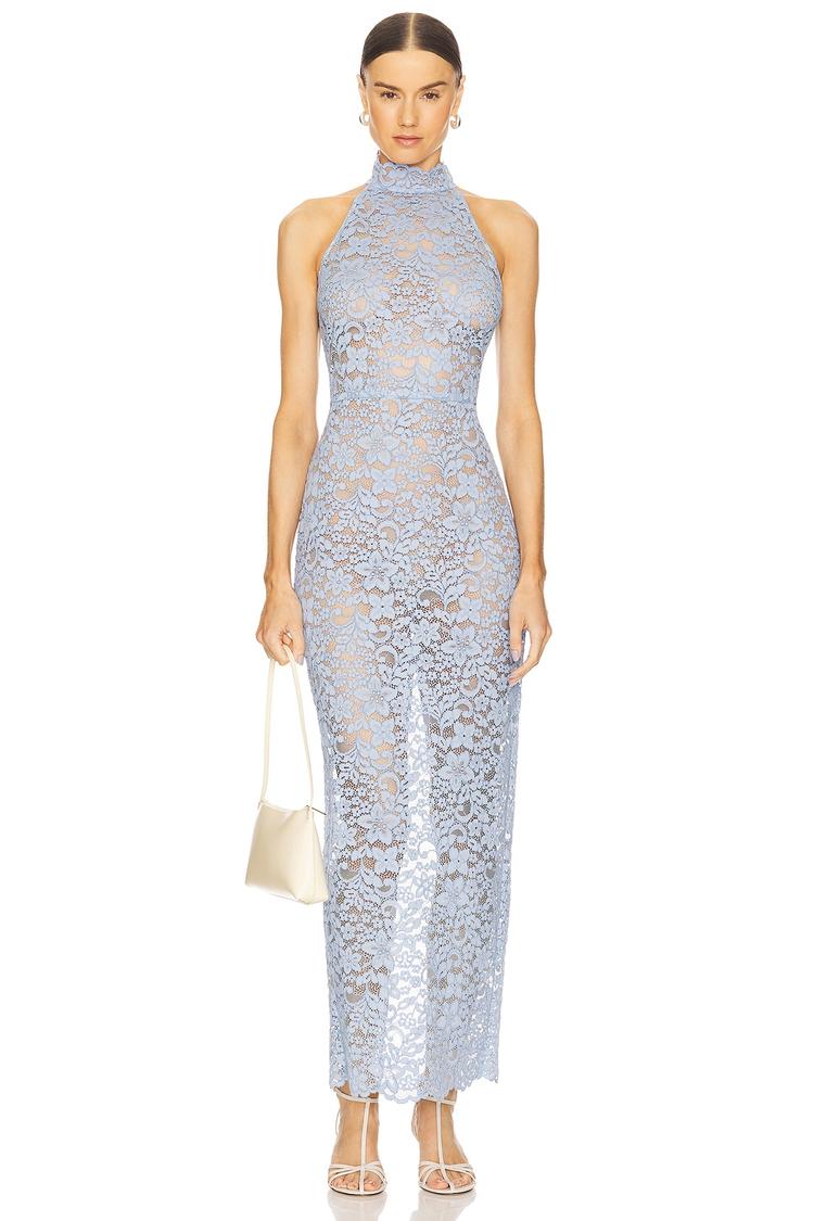Delicate lace fabric in a light blue hue defines this elegant column maxi dress, featuring a sleek mock neck and sleeveless design that flatters the silhouette with a slim fit. The hidden back zipper ensures a smooth finish, while the sheer quality adds a subtle allure perfect for sophisticated summer and spring occasions. Ideal for cocktail parties, formal events, and romantic date nights, this dress combines classic style with lightweight comfort and refined lace detailing all over the garment.