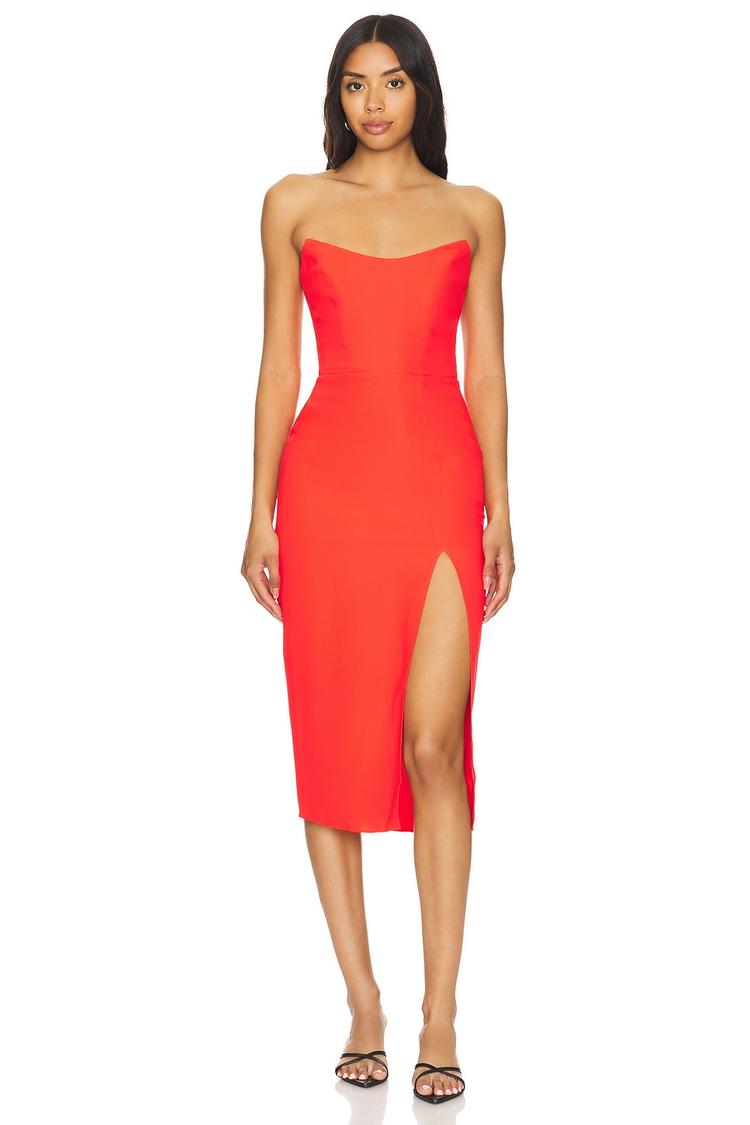 A bold bright red crepe sheath dress with a figure-hugging fit and a sleek straight neckline, this midi dress features a boned bodice for structured elegance and smocked sides for added comfort. The concealed back zipper and strapless silhouette highlight a clean back design, while a daring side slit adds a touch of allure. Crafted from smooth polyester fabric, it is perfect for spring and summer cocktail parties, date nights, or nights out, combining sophistication with modern edge.