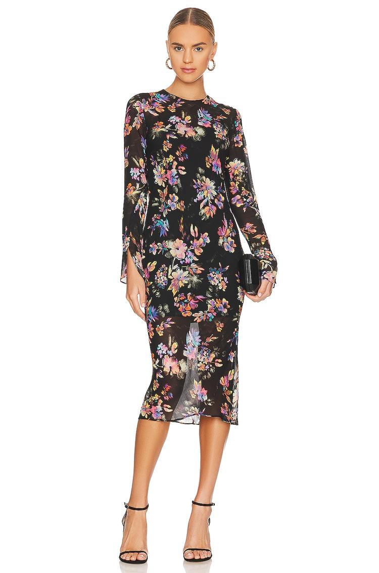 Graceful and refined, this fitted sheath midi dress features a matte black chiffon fabric adorned with delicate all-over floral prints in soft pinks, lavenders, and blues. The round neckline and long regular sleeves complement the elegant silhouette, while split cuffs add subtle interest. A keyhole back with hook closure enhances the sophisticated appeal. Fully lined with viscose and polyester for comfort, this versatile piece suits cocktail parties, date nights, and stylish evening events across autumn, winter, and spring seasons.