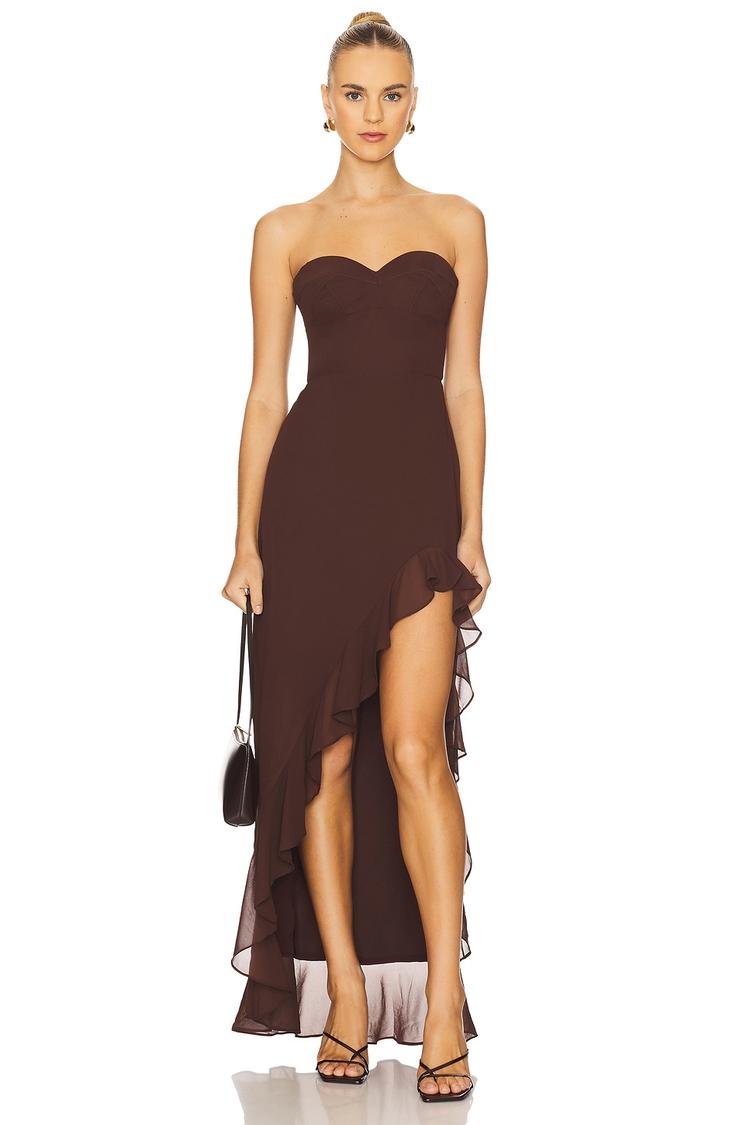 Soft matte polyester crepe forms an elegant column silhouette with a fitted bodice and a strapless sweetheart neckline. The dress features a striking high-low asymmetric hemline accented with delicate ruffles, creating fluid movement and a sophisticated finish. Perfect for spring and summer cocktail parties, semi-formal events, or romantic date nights, this gown blends modern style with timeless elegance. The hidden back zipper and smocked bonded sides ensure a comfortable, flattering fit, making it a versatile choice for standout evening occasions.