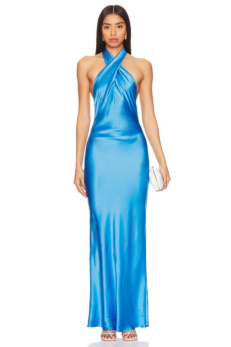 Sleek satin fabric in a striking blue jay hue defines this column gown with a twisted halterneck tie, creating a timeless silhouette that embraces elegance and class. The open back and sleeveless design add a sultry allure, perfect for formal evenings, galas, or cocktail parties. Its slim fit and maxi length offer a figure-enhancing profile, making it a standout piece for prom or wedding guest occasions. Crafted from luxurious silk satin, this gown is as comfortable as it is sophisticated, embodying refined glamour for special celebrations.