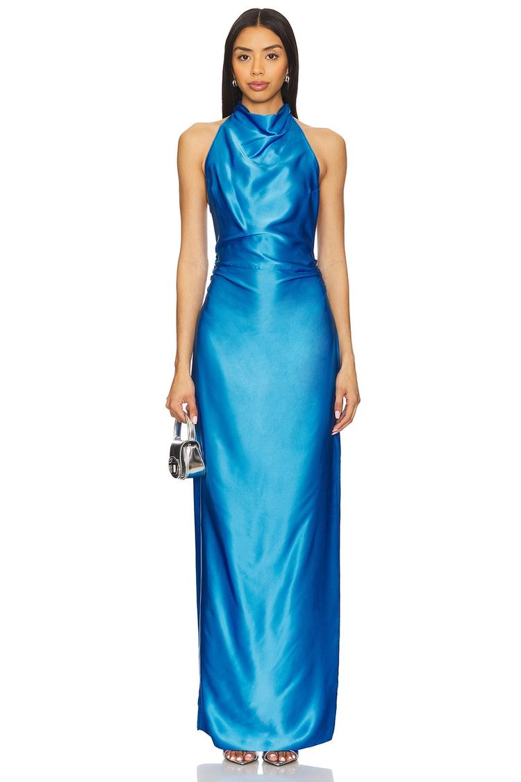 Satin bright blue silk flows effortlessly in this column maxi dress featuring a draped neckline and halterneck styling with a hook closure. The open back and ruched sides enhance its slim fit silhouette, complemented by a back vent for ease of movement. Perfect for cocktail events, formal occasions, and wedding guests, this elegant and classic piece captures sophisticated charm with luxurious fabric and clean hemline details.