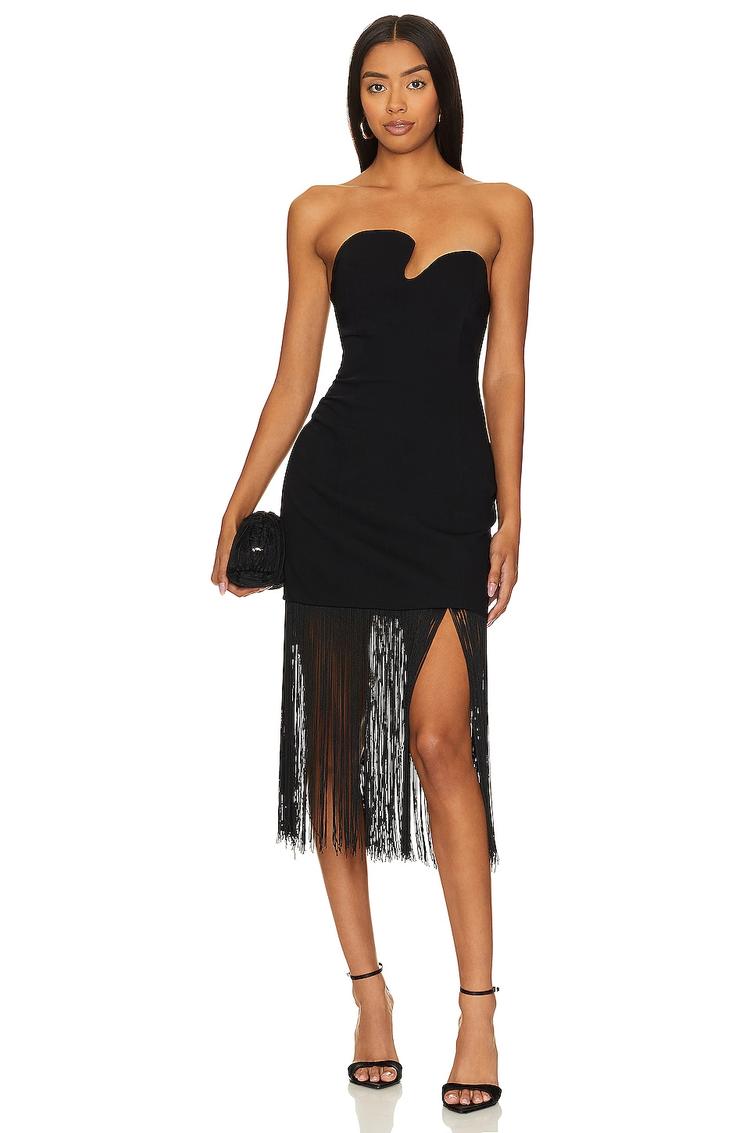 An elegant black sheath dress crafted from midweight polyester crepe fabric features a striking asymmetric neckline and a fitted silhouette that highlights the figure. The strapless design and concealed back zipper add sleekness, while the unique fringe detailing on the hem brings dynamic movement to the midi-length dress. Perfectly suited for cocktail parties, night outs, and romantic date nights, this versatile piece combines modern style with a sexy edge, making it a standout choice for various evening occasions.