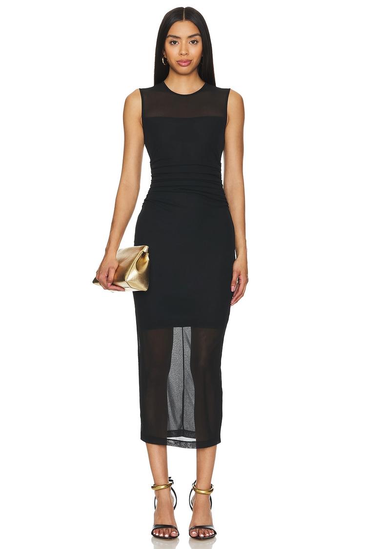 A sleek silhouette and fitted midi length define this sleeveless sheath dress, crafted from stretchy polyester-elastane blend for comfort and ease. The modern round neckline pairs beautifully with subtle ruching on the sides, enhancing the figure. A keyhole back with a hook and eye closure adds a touch of elegance, while the concealed back zipper ensures a smooth finish. Perfectly suited for cocktail parties, date nights, or nights out, this sophisticated black dress transitions effortlessly across seasons and occasions.