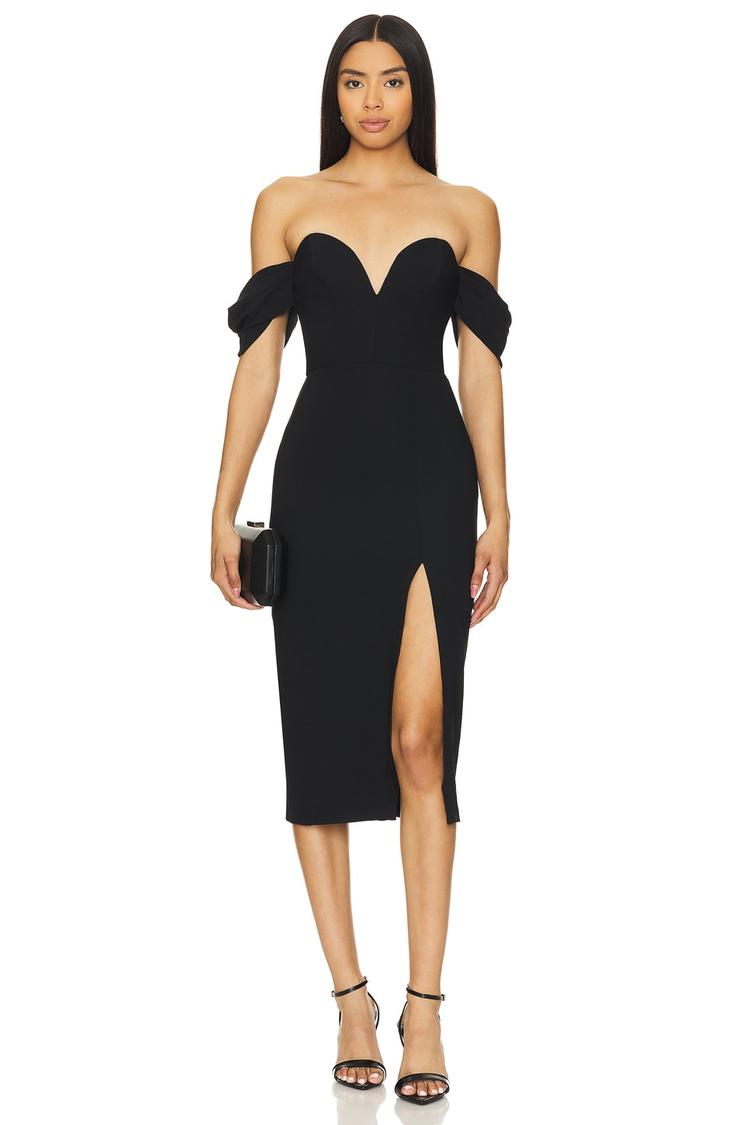 A sleek matte black crepe sheath dress with a chic off-shoulder design and a flattering front V-wire neckline. The fitted silhouette is enhanced by a side slit hem, creating a modern and elegant look. Perfect for date nights, cocktail events, or a sophisticated night out, this midi dress offers timeless sophistication with a lightweight feel and concealed back zipper closure for a seamless finish.