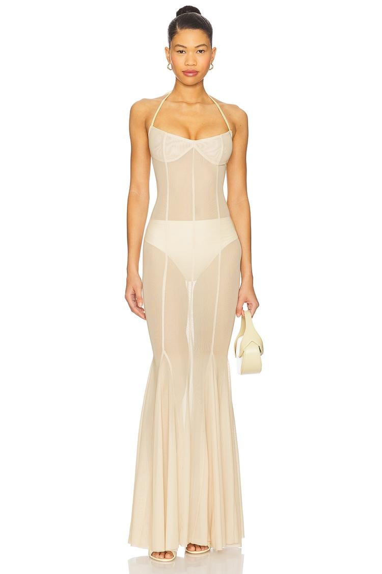 Soft beige mesh with a figure-hugging slip silhouette creates an alluring maxi perfect for summer evenings. The halter neckline with self-tie closure and hidden back zipper enhance the slim fit, while sheer panels add a modern sexy edge. Crafted from a midweight blend of viscose, polyester, and spandex, this dress offers both comfort and stretch. Ideal for date nights, cocktail events, or nights out, it pairs effortlessly with minimalist accessories to elevate your look.