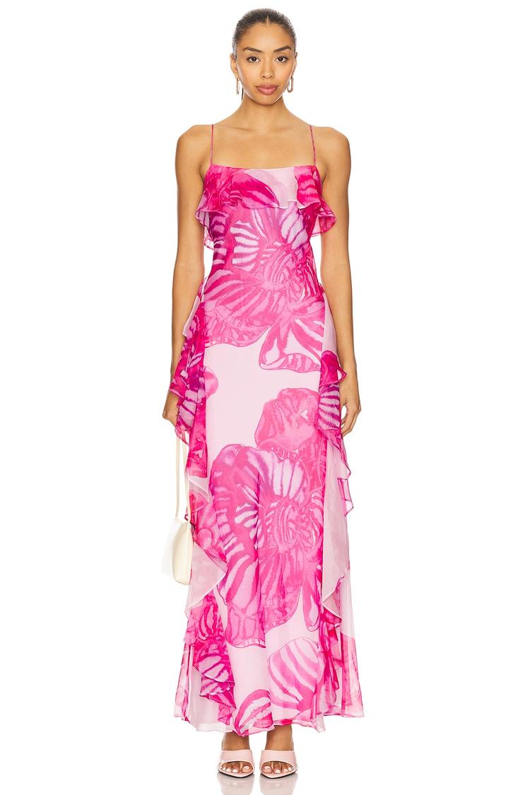 Soft midweight chiffon fabric and a slim column silhouette come together in this elegant maxi gown featuring an all-over tropical floral print in vibrant pink hues. The straight neckline and delicate spaghetti straps frame the shoulders beautifully, while ruffled details cascade throughout the dress for a romantic, flowing effect. Perfectly suited for spring and summer events, this gown is ideal for cocktail parties, formal occasions, or wedding guest attire. A hidden side zipper ensures a smooth fit and clean back styling.
