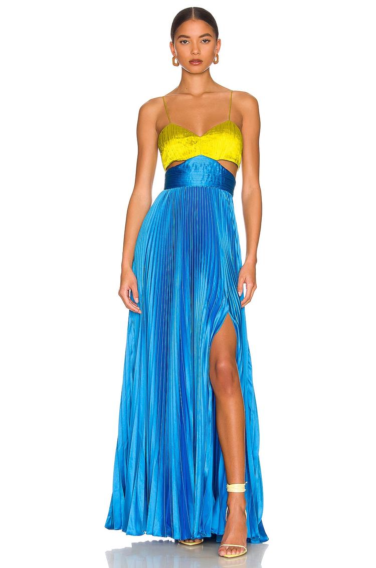 Vibrant matte bright yellow meets matte bright blue in this elegant column gown featuring a sweetheart neckline and strapless sleeves. Crafted from pleated satin fabric with a flowing maxi length, the dress flaunts a side slit and cut-out detail for added allure. Its fitted silhouette and concealed back zipper ensure a sleek look perfect for formal occasions, cocktail parties, and galas. The pleating adds texture and movement, making it a sophisticated choice for any upscale event.