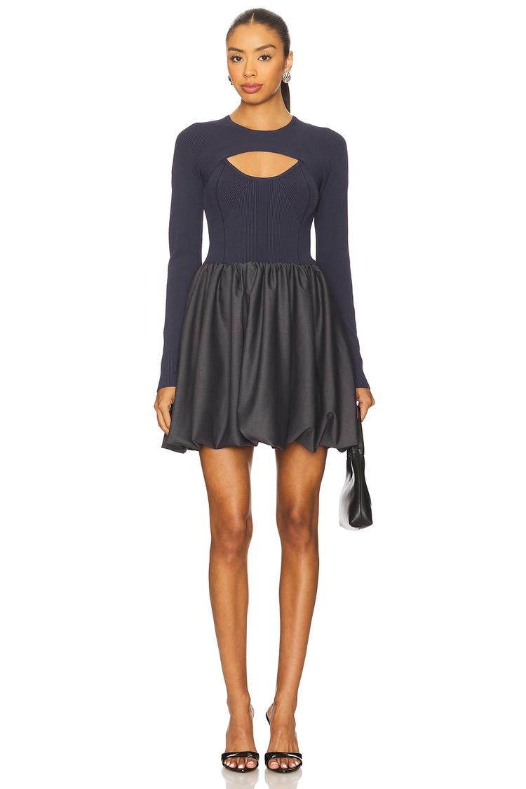 A ribbed, midweight jersey bodice meets a broadcloth bubble hem skirt in this chic babydoll mini dress. The long sleeves and keyhole neckline add a subtle sexy touch while the flared silhouette flatters effortlessly. Perfect for autumn and spring outings, it transitions seamlessly from casual brunches to night outs and date nights with ease. Crafted from recycled viscose and polyester, it combines comfort with sustainability in a modern, matte dark blue finish.