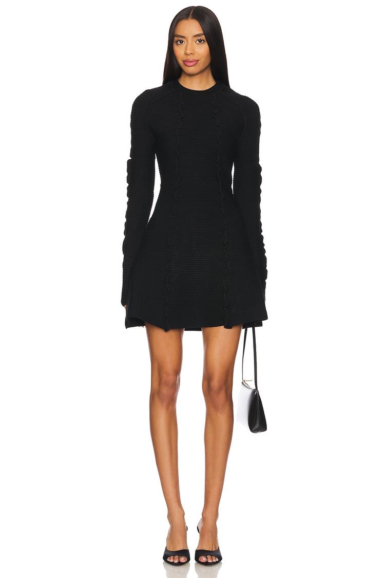 Textured heavyweight knit fabric in a matte black hue shapes this fitted A-line mini dress featuring long regular sleeves with delicate ruffle details at the sleeves and hemline. The classic crew neckline and covered back complement its minimalist yet chic style, making it a versatile choice for casual outings, workwear, or a stylish date night. Crafted with a blend of recycled viscose, polyester, nylon, and spandex, this dress offers comfortable pull-on wear with a flattering silhouette for cooler autumn and winter seasons.
