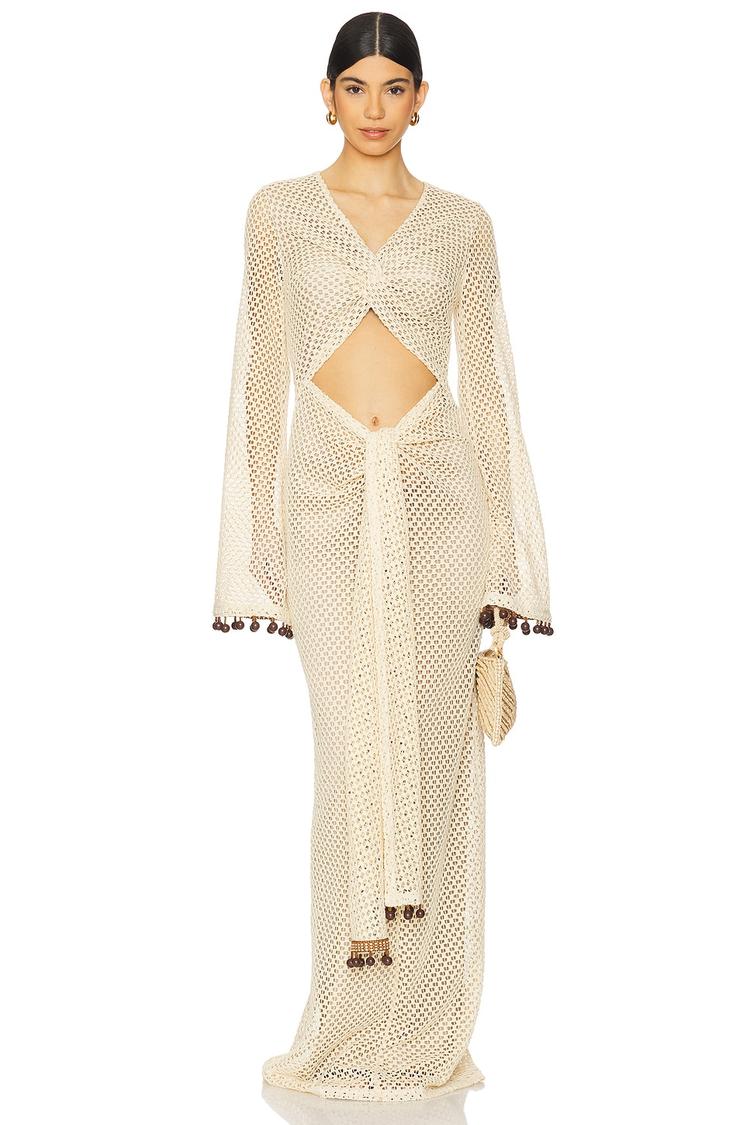 Delicate crochet texture and a figure-flattering column silhouette define this beige maxi dress. The long flared sleeves with beaded trim and the twist bodice with sash ties add romantic elegance, complemented by tassel details at the hem and cuffs. Crafted from breathable cotton, this dress is ideal for spring and summer occasions such as cocktail parties, date nights, and night outs. The concealed back zipper with hook closure ensures a smooth fit, making it a sophisticated yet bohemian choice for stylish events.